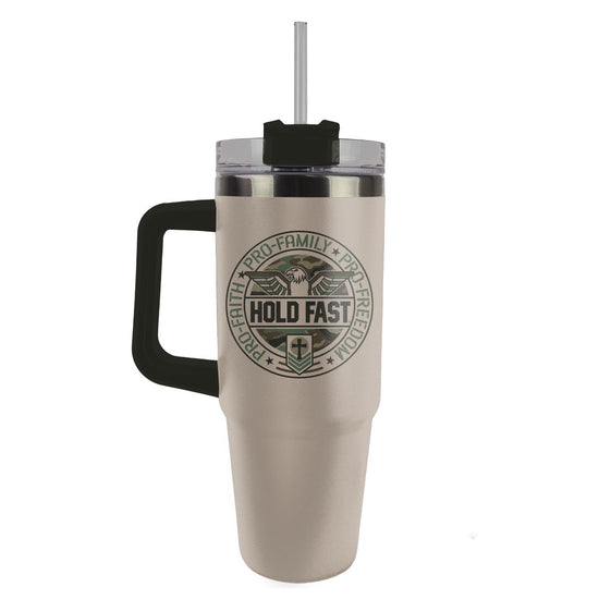 Stand up for what you believe in with every sip from this “HF Pro Faith Eagle” 30 oz. Stainless-Steel Mug with Straw by HOLD FAST® in Tan with a convenient swivel lid closure. You’ll stay hydrated at work, school, or in the great outdoors with this practical handled tumbler. Remain steadfast to your core values and boldly stand up for your beliefs!