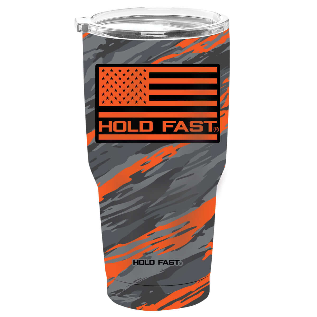 Share your faith in America with this rugged “Painted Stripe Camo” 30 oz. Stainless-Steel Tumbler in Grey/Orange Camo by HOLD FAST®. The flag of the United States of America is worthy of celebration! We can stand up for our flag because of the sacrifice of those who serve in the United States Armed Forces, and ultimately because of the sacrifice of our Lord and Savior, Jesus Christ, on the cross at Calvary. When you pledge allegiance to the flag or see those colors flying in the breeze, think on these things.