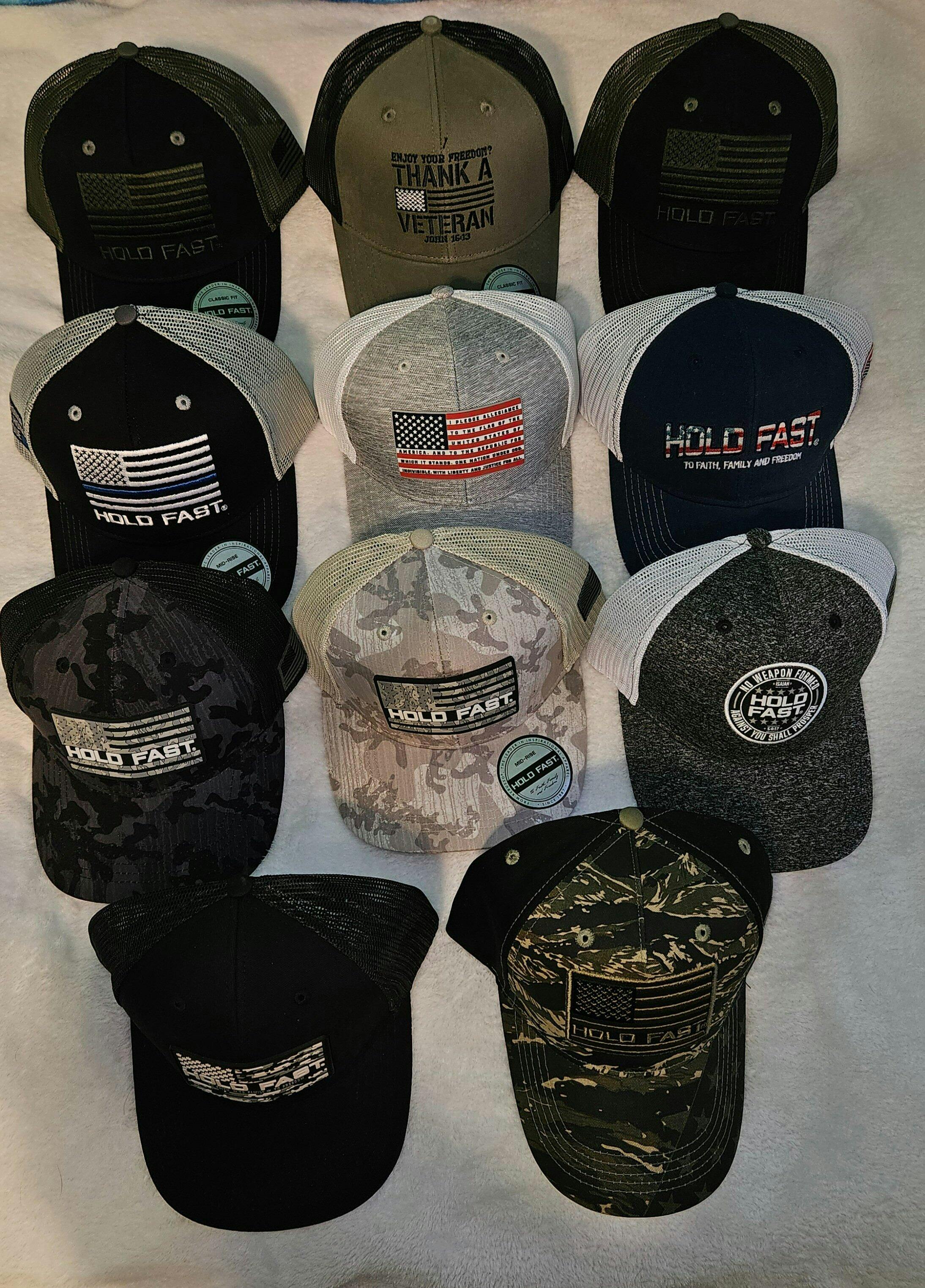 This black trucker-style cap features a soft rubber patch with a stylized American flag and the words HOLD FAST, backed by the motto: “To Faith. To Family. To Freedom.” It’s more than a hat: it’s a statement. Whether you’re working the land, grilling on the weekend, or standing guard over your home and values, this cap reminds the world what you stand for.
