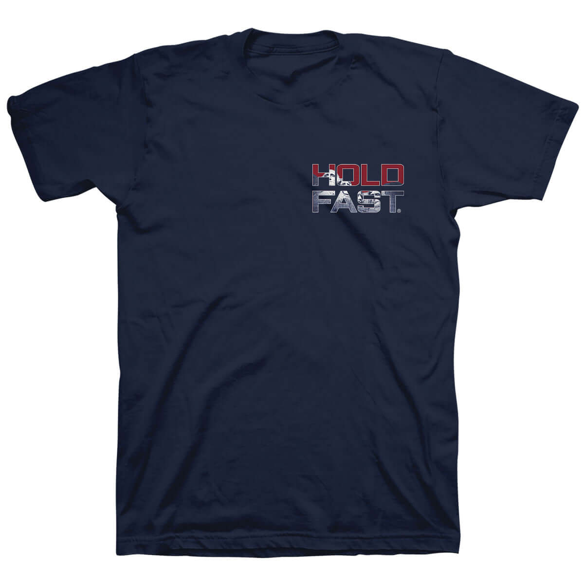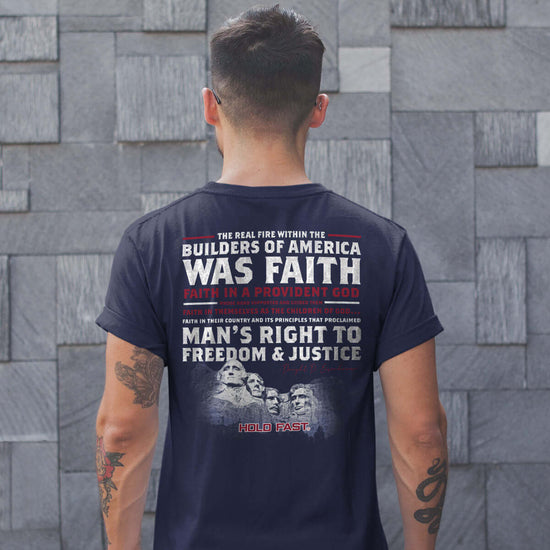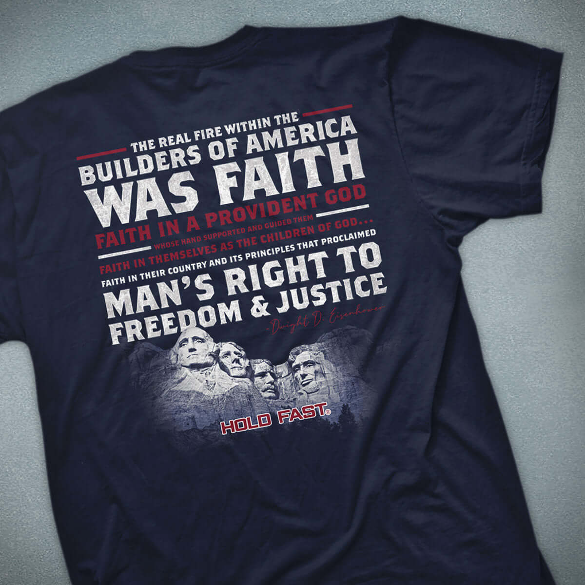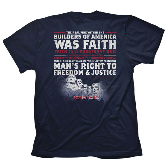 Light a fire for faith in God and in America in this patriotic “Builders Of America/Rushmore” T-shirt by HOLD FAST® in Navy. Let us not forget this nation was founded not only on the principles of democracy, but with a steadfast faith in our Creator God.