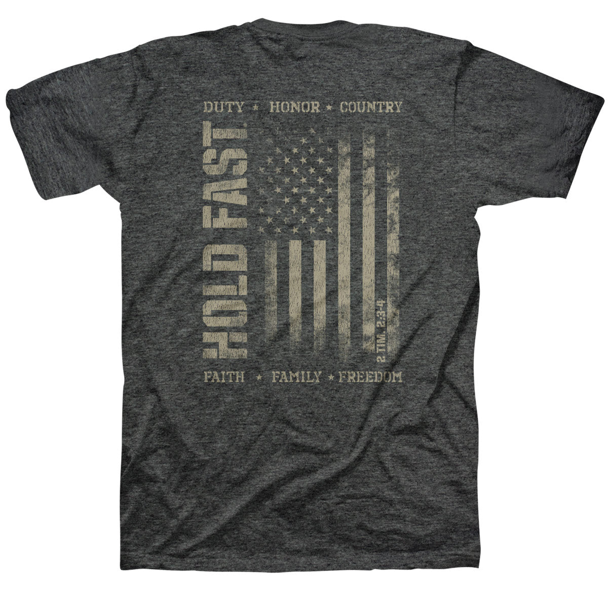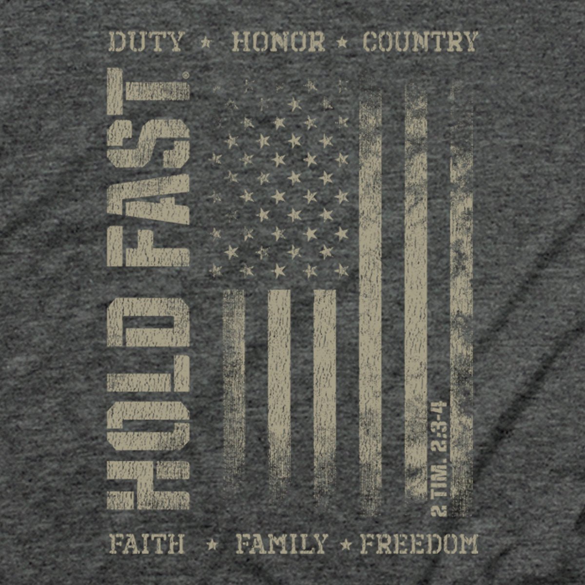 Stand firm for what matters in this “Duty & Honor” Hold Fast® Adult T-Shirt in Dark Heather. It’s a battle cry for men who live with integrity, stand for freedom, and put their faith into action.