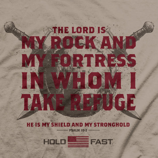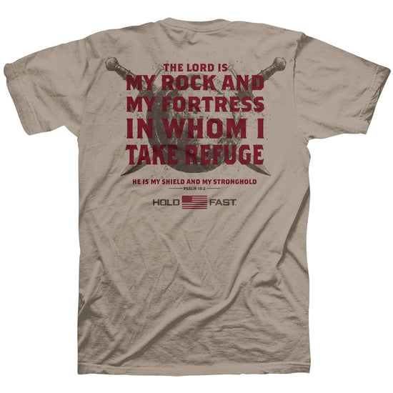 Take a strong stand for faith in this “Fortress Shield” HOLD FAST® T-Shirt in Sand. No foe and no circumstance can stand against you, when you bear the shield of almighty God.
