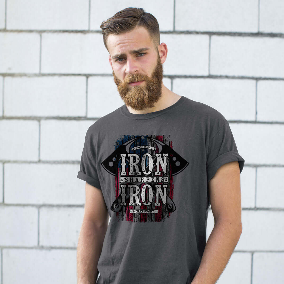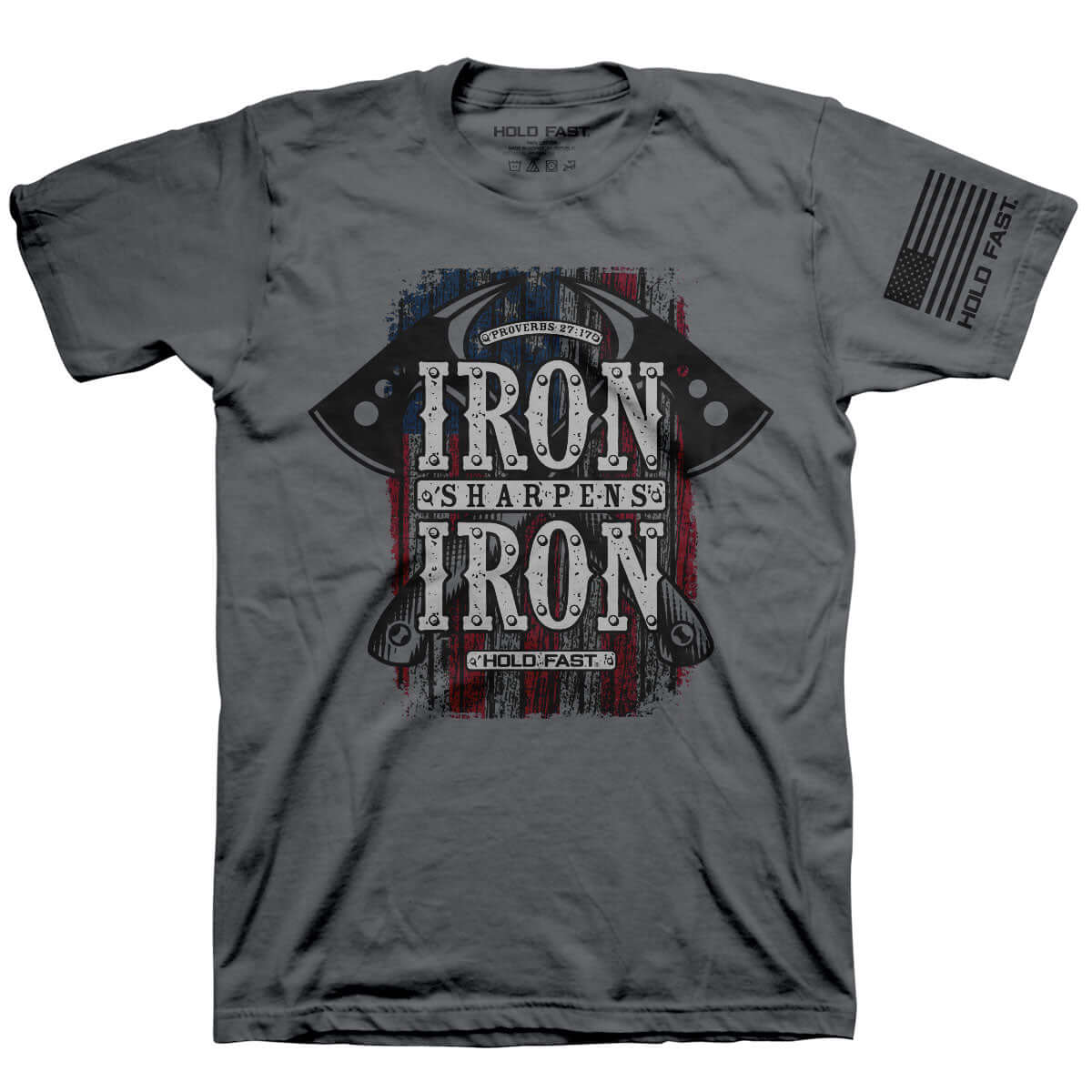 Sharpen those around you in this “Iron Axes” T-shirt by HOLD FAST® in Charcoal. We are shaped by the company we keep, and it is God's will that we surround ourselves with fellow believers in addition to reaching out to those who haven't met Him yet.