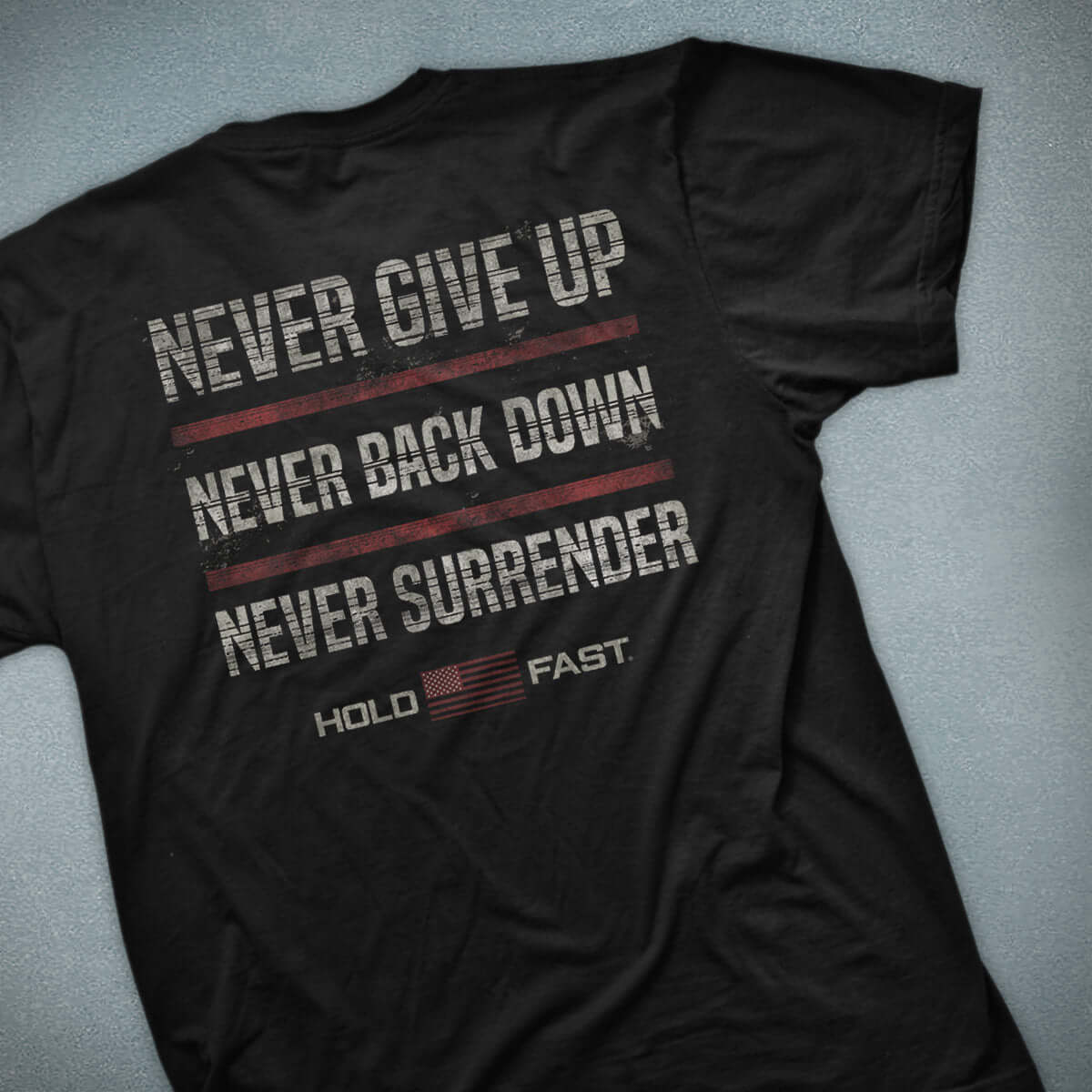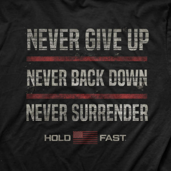 Stand your ground in this statement-making “Never Give Up” T-shirt by HOLD FAST® in Black. You aren’t a spectator in this life, you’re a participant: ready for battle, prepared to stand up for who and what you believe in. You will never surrender!