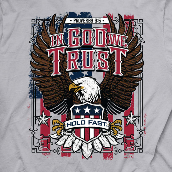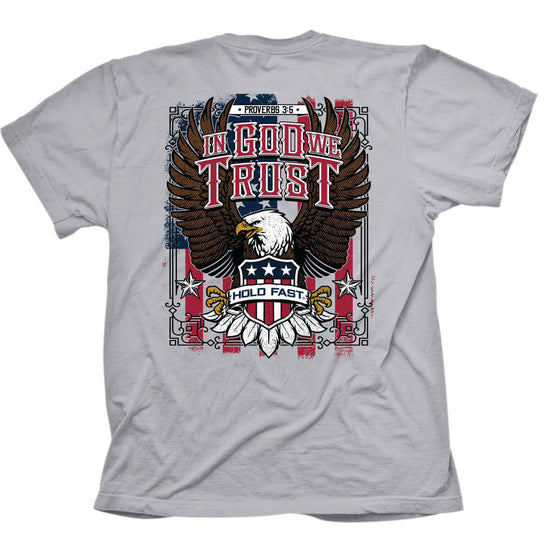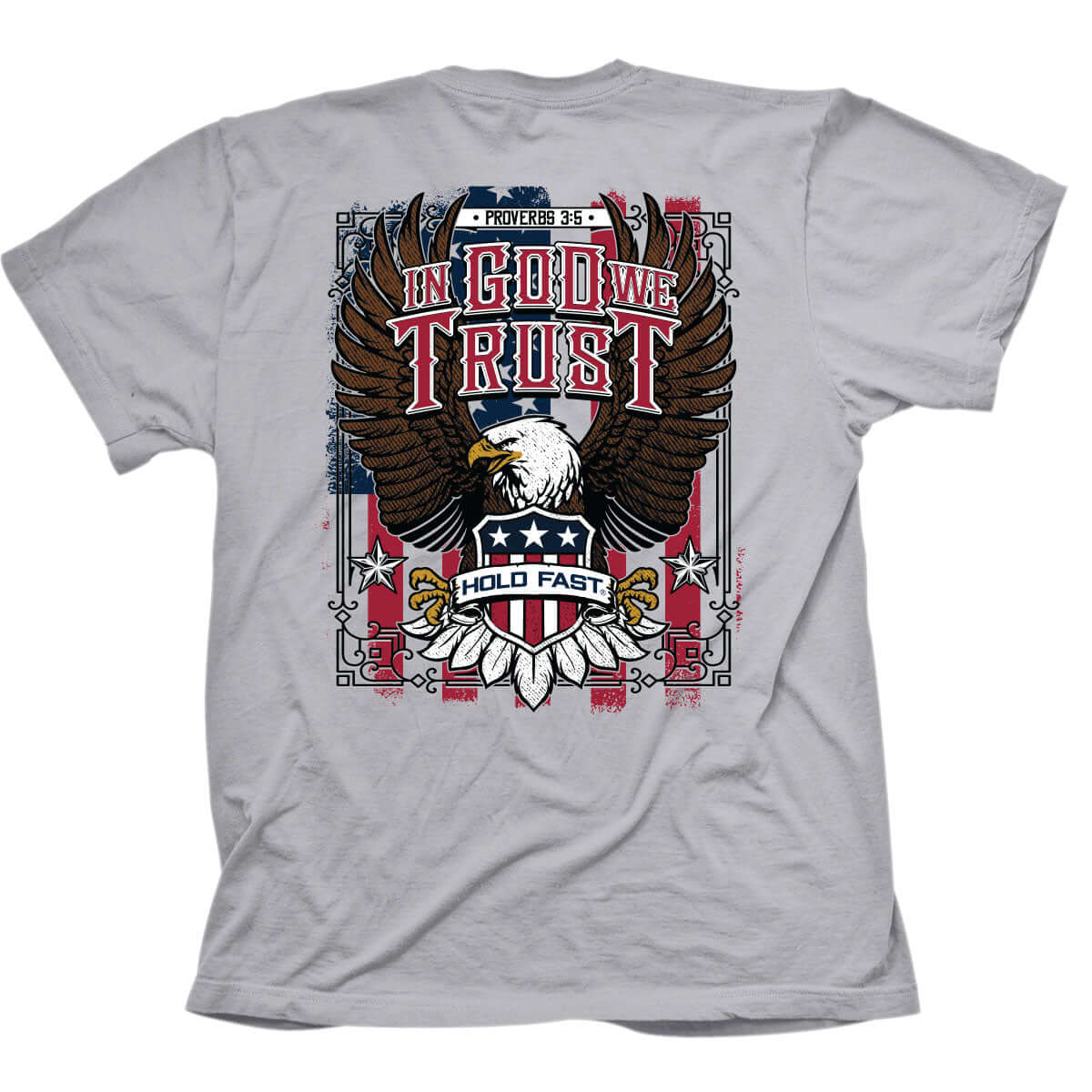 Make a bold statement of faith in this cool “Trust Eagle” T-shirt by HOLD FAST® in Silver. The fierce beauty and proud independence of the majestic American Eagle aptly symbolizes the strength and freedom of America.