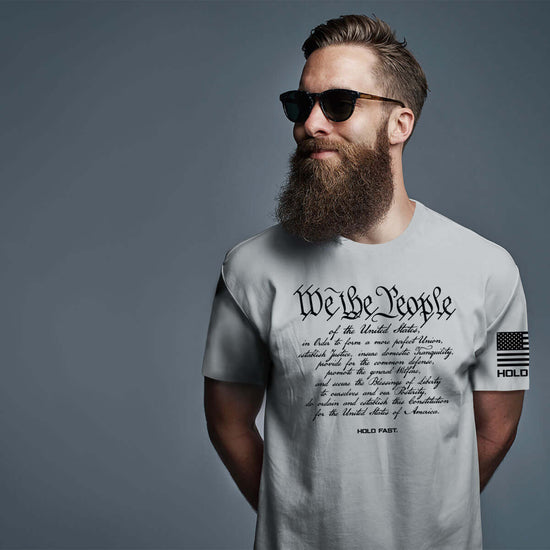 Celebrate your rights as an American citizen in this classic “We The People” T-Shirt in Silver by HOLD FAST®. The Constitution, signed on September 17, 1787, established America’s national government and guaranteed certain fundamental rights for the citizens of our nation. The United States Constitution is the oldest written national constitution in use, and this beautiful intellectual work is a model for an imperfect, but ‘more perfect’ union.
